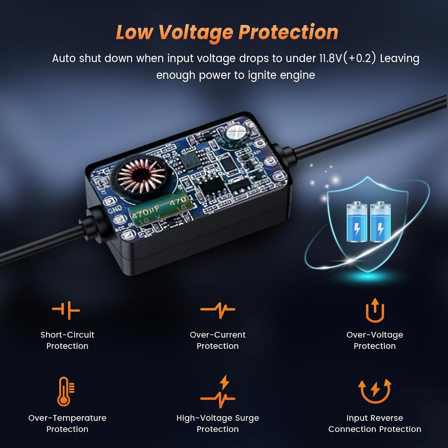 - 24/7 Parking Surveillance Directly to the battery for constant 24hrs/7days power to protect against theft when your car is in the parking lot.