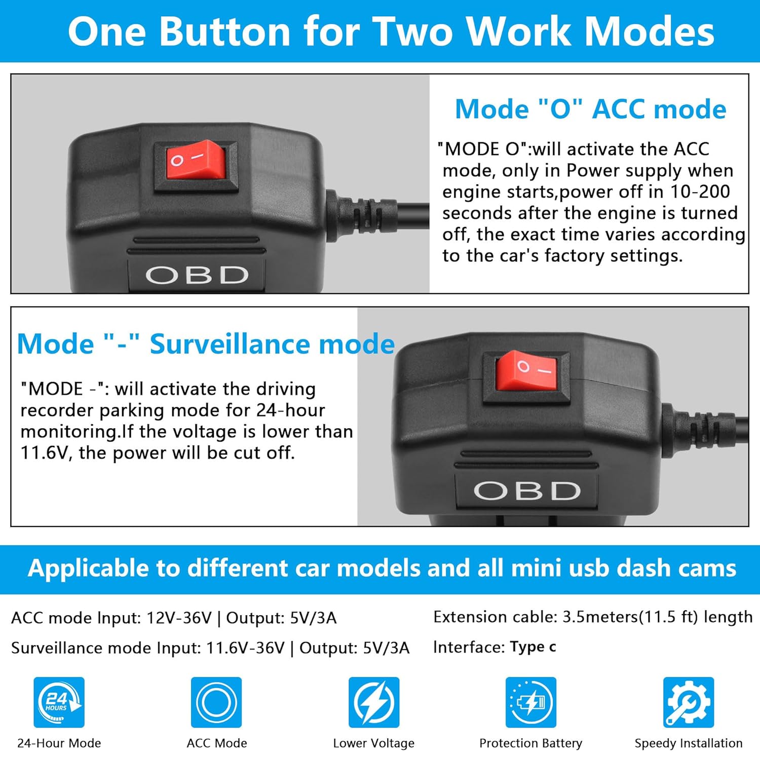 Dash cam obd power cable is suitable for all type-c usb port electronic devices. Designed to provide continuous power supply 24 hours after parking for in-car devices like dash cam dvr, mirror recorder, moble phone, tablets etc.